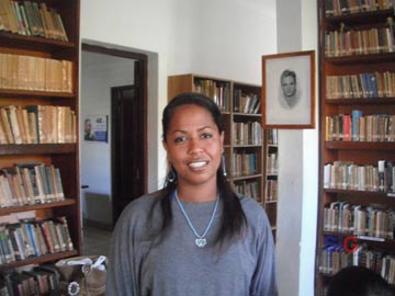 Janet, en la biblioteca con la foto de fondo de Smith Comas en la ciudad de Varadero.